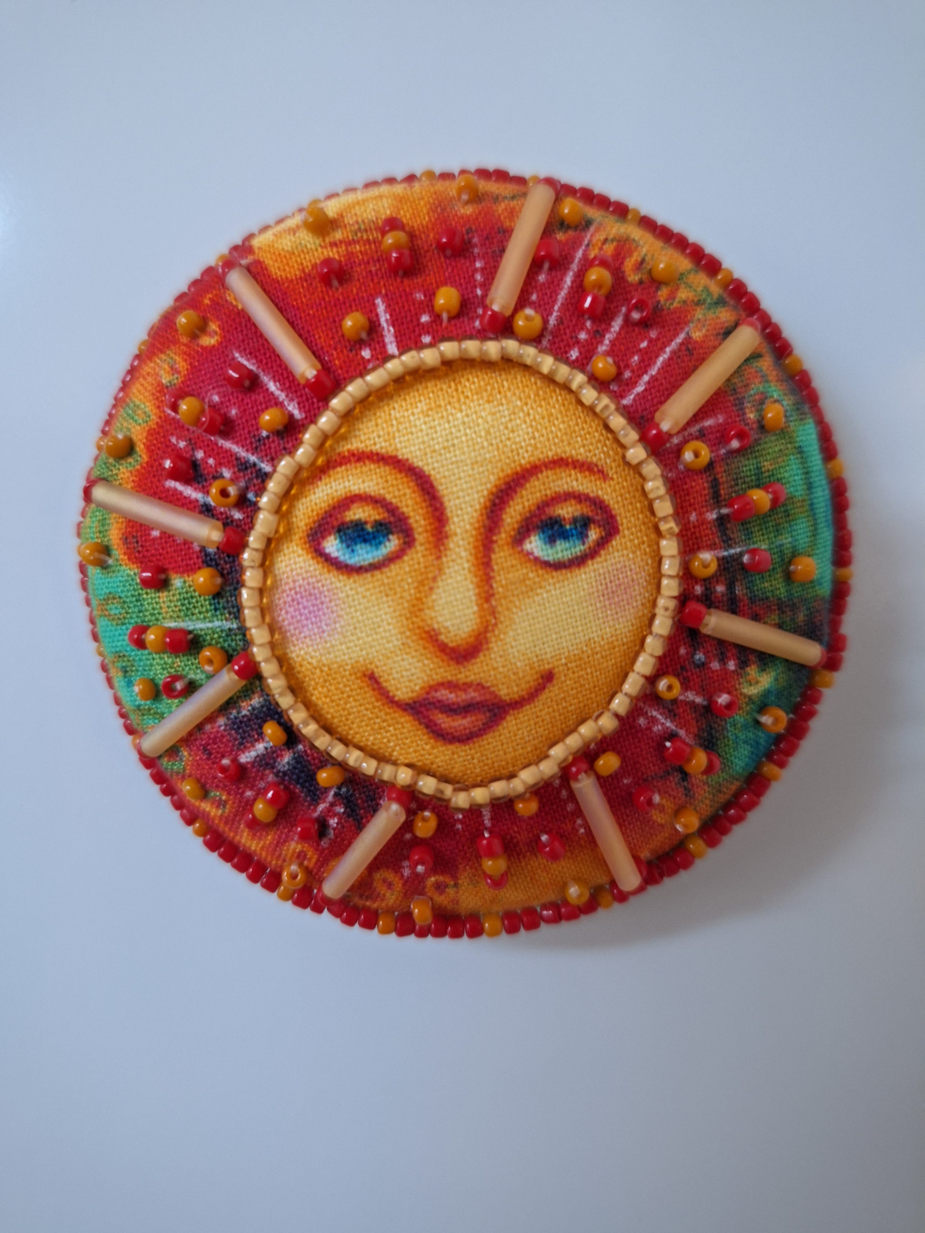 I was fortunate to find some wonderful printed cotton with moon, star and sun faces. You have seen some on some of the beaded wall art in prior posts. I decided that doing a beaded magnet would be fun too.